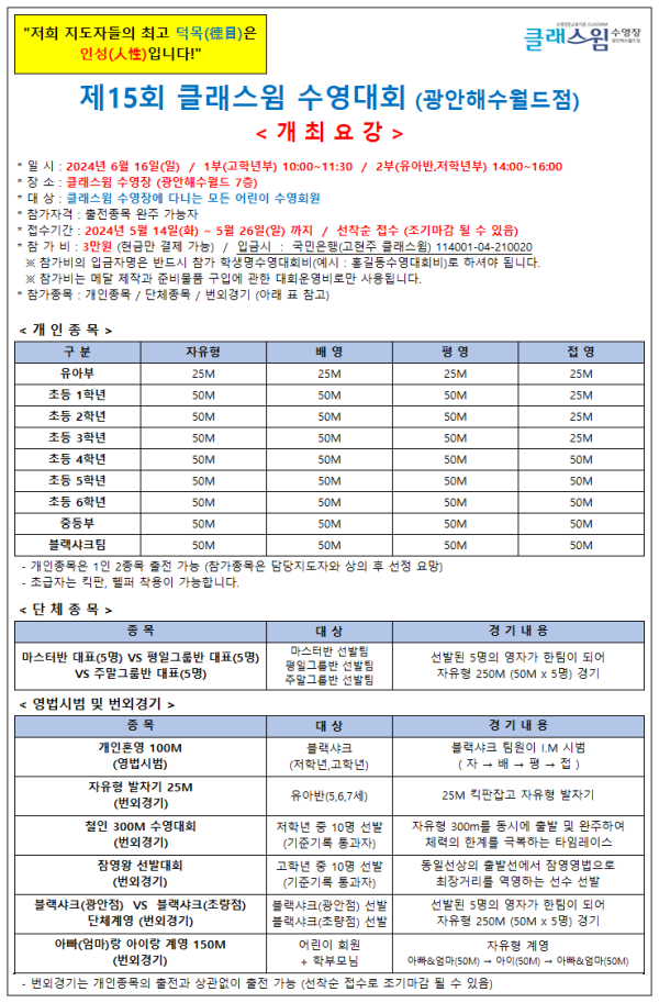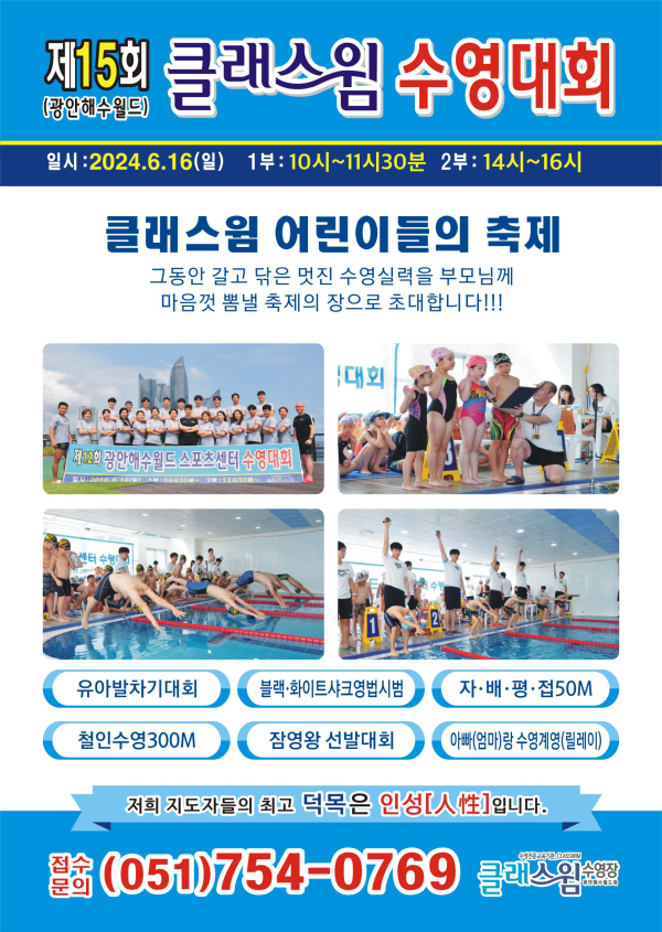 <제15회 클래스윔 수영대회> 페이지 정보 작성자 최고관리자 조회 1,826회 댓글 0건 작성일 24-05-11 20:18 목록 본문 제15회 클래스윔 수영대회 이전글 다음글 댓글목록 댓글목록 등록된 댓글이 없습니다.